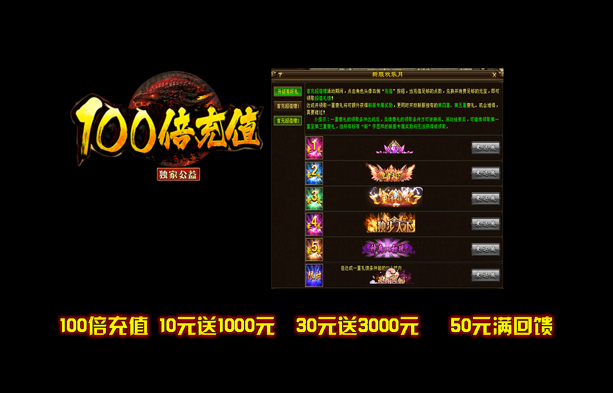 【天下第一】:「战场内爆100元充值点,3000W赠点票,100万门贡票和各种坐骑神装等非卖品」